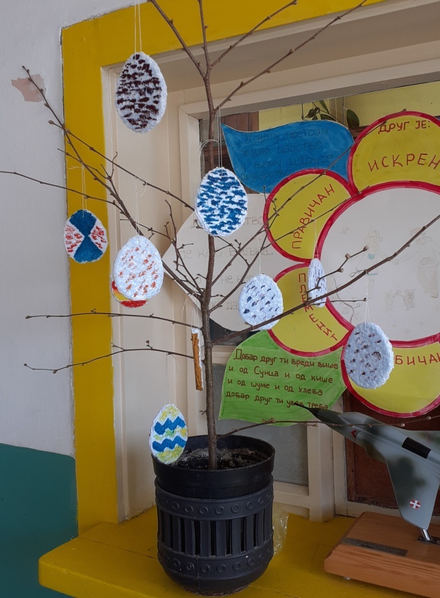 Поводом обележавања Васкрса, ученици наше школе припремили су пригодну декорацију. Били су веома маштовити и оригинални у изради и декорацији јаја и корпица. Користили су различите технике и методе рада, по слободном избору. Резултати рада су приказани кроз фотографију у прилогу.