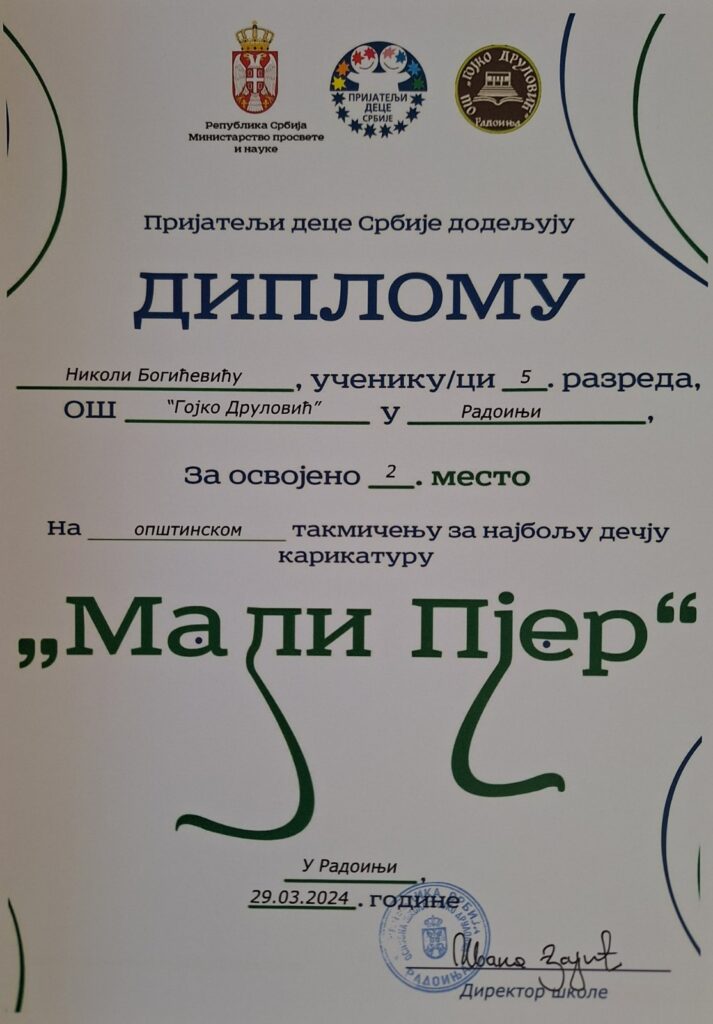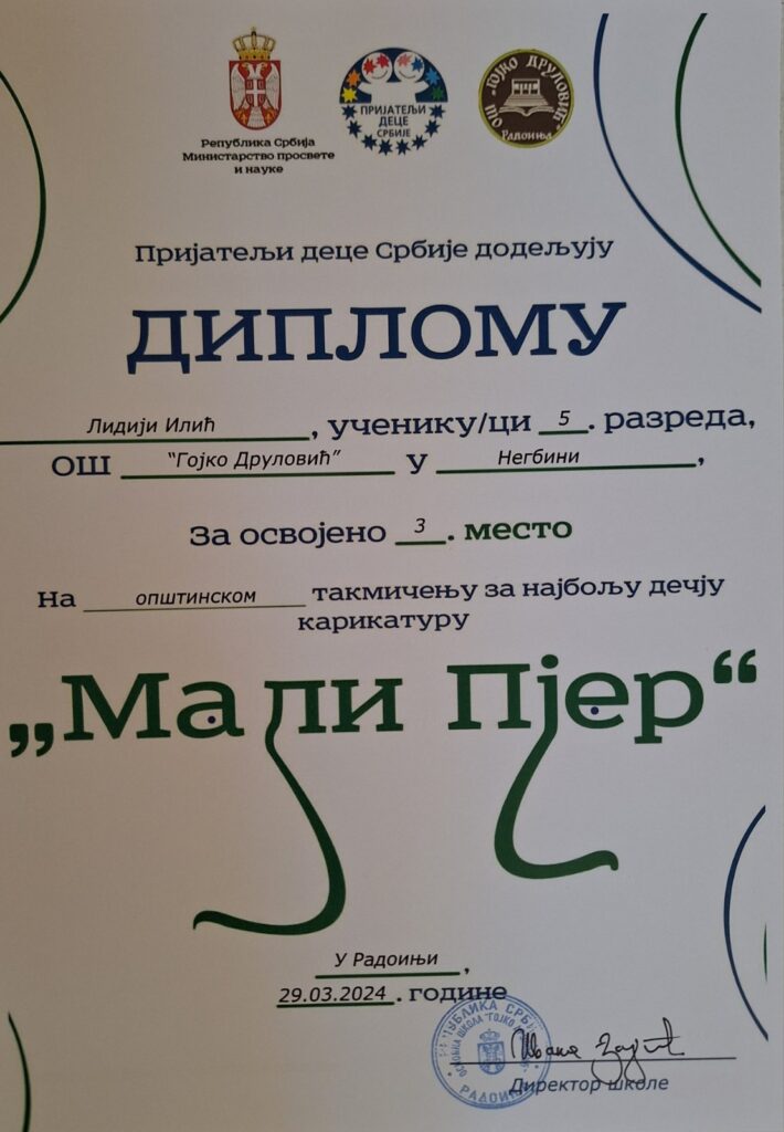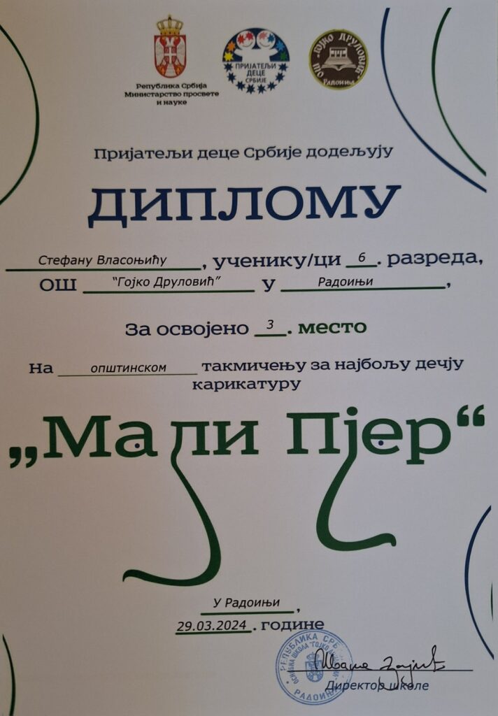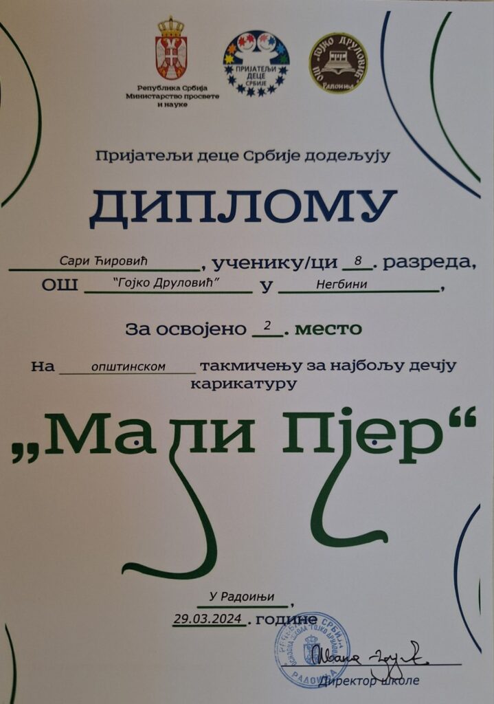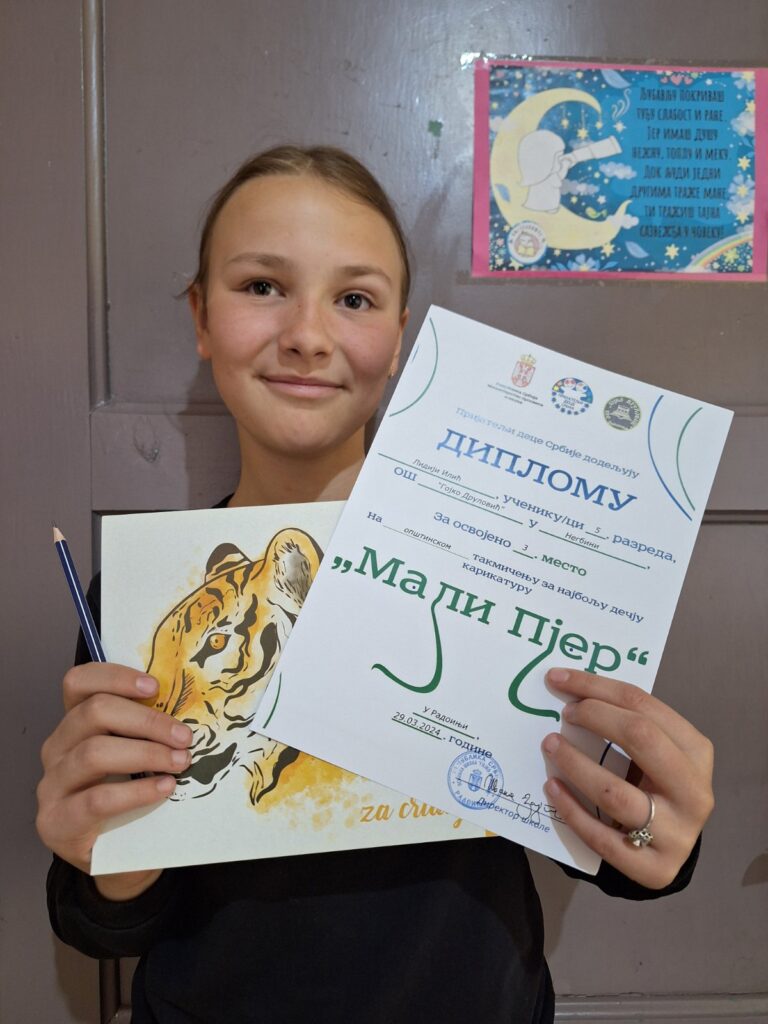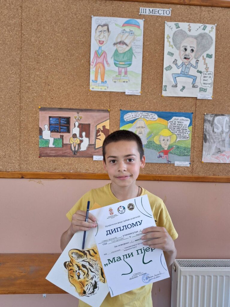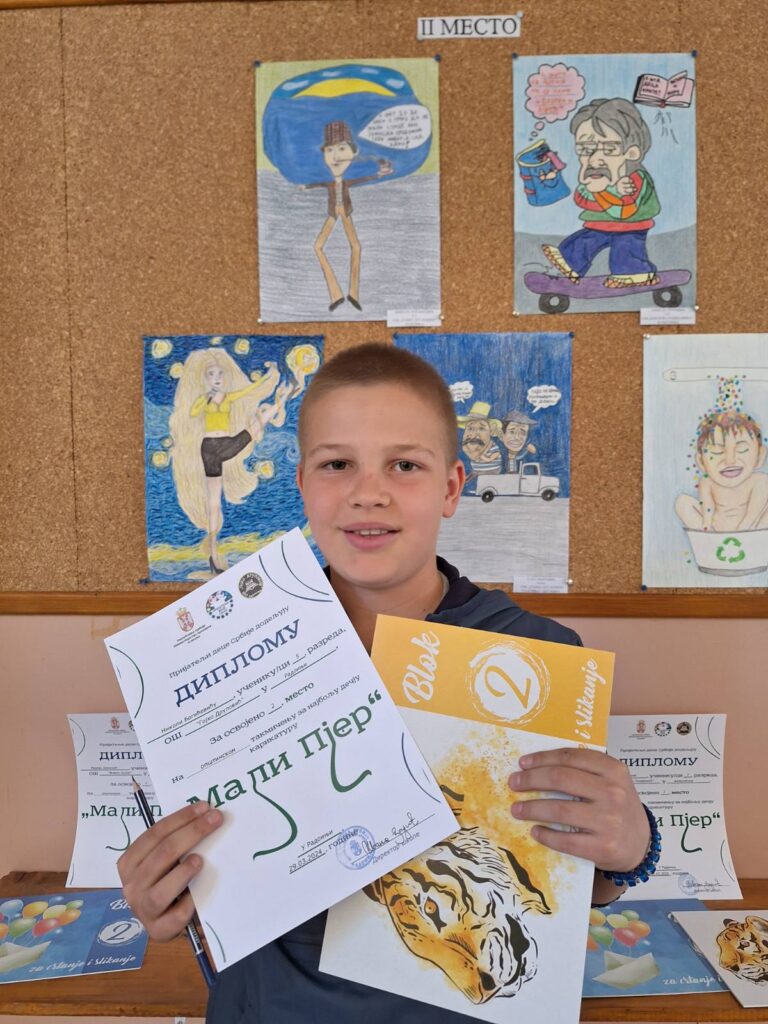 На Општинском такмичењу за најбољу дечију карикатуру, од 15 награђених ученика, четири су из наше школе. Стефан Власоњић (VI/1) из матичне школе и Лидија Илић (V/2) из издвојеног одељења у Негбини су освојили треће место, док су Никола Богићевић (V/1) и Сара Ћировић (VIII/2) били другопласирани.